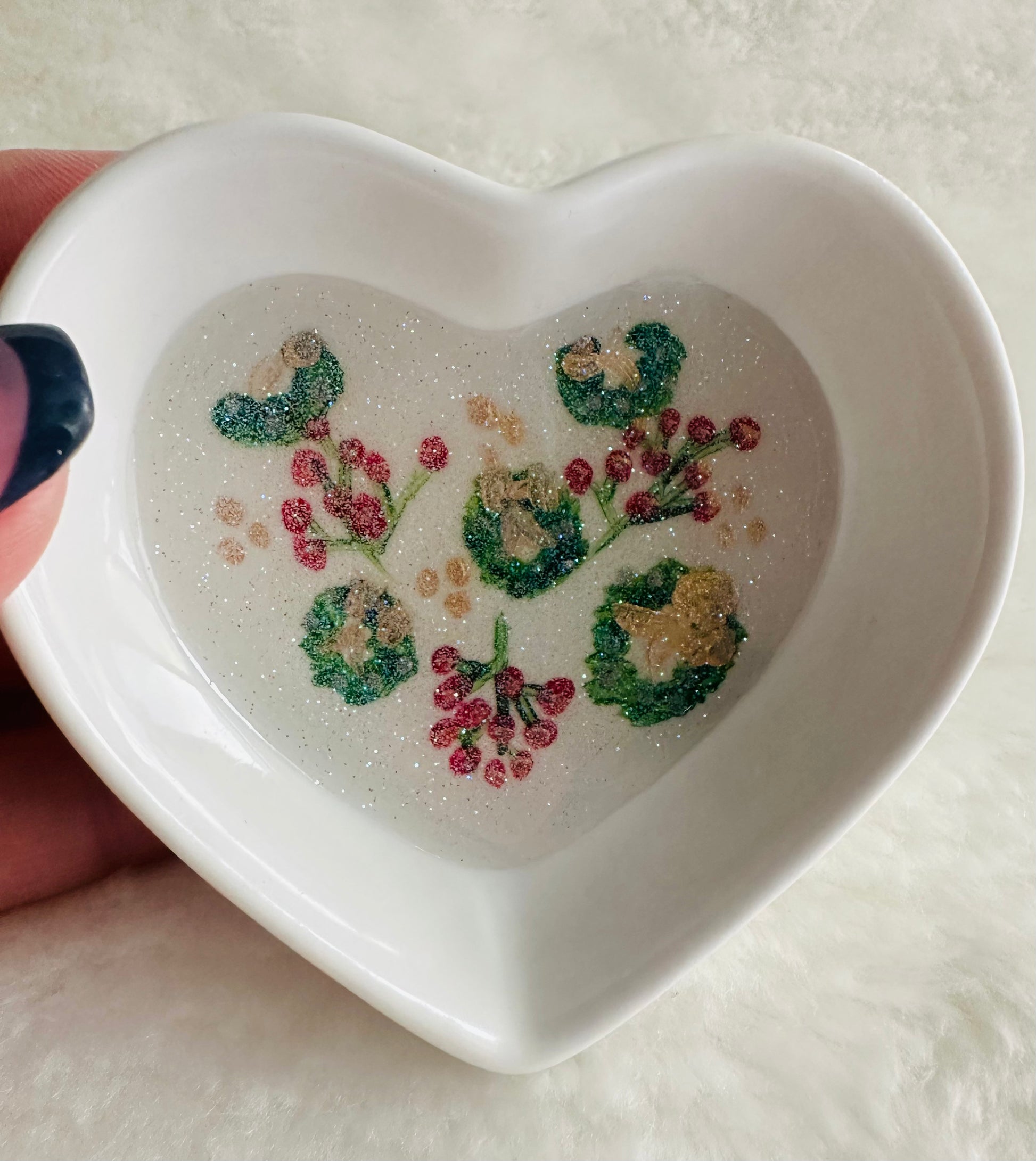 Hand painted and then coated with a layer of resin to protect the art. The small dishes measure 8cm across and 3 cm deep