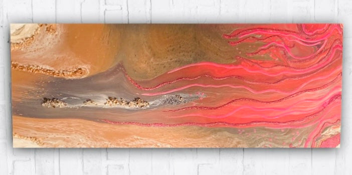 If you can believe it, this canvas started out with greys and tan colours. Then as I played with the paint, and it moved about I grabbed the coral colour and glow products and boom- the coral waves could now be seen after dark. Just add some sun or UV light and this canvas can be enjoyed not just during the day.