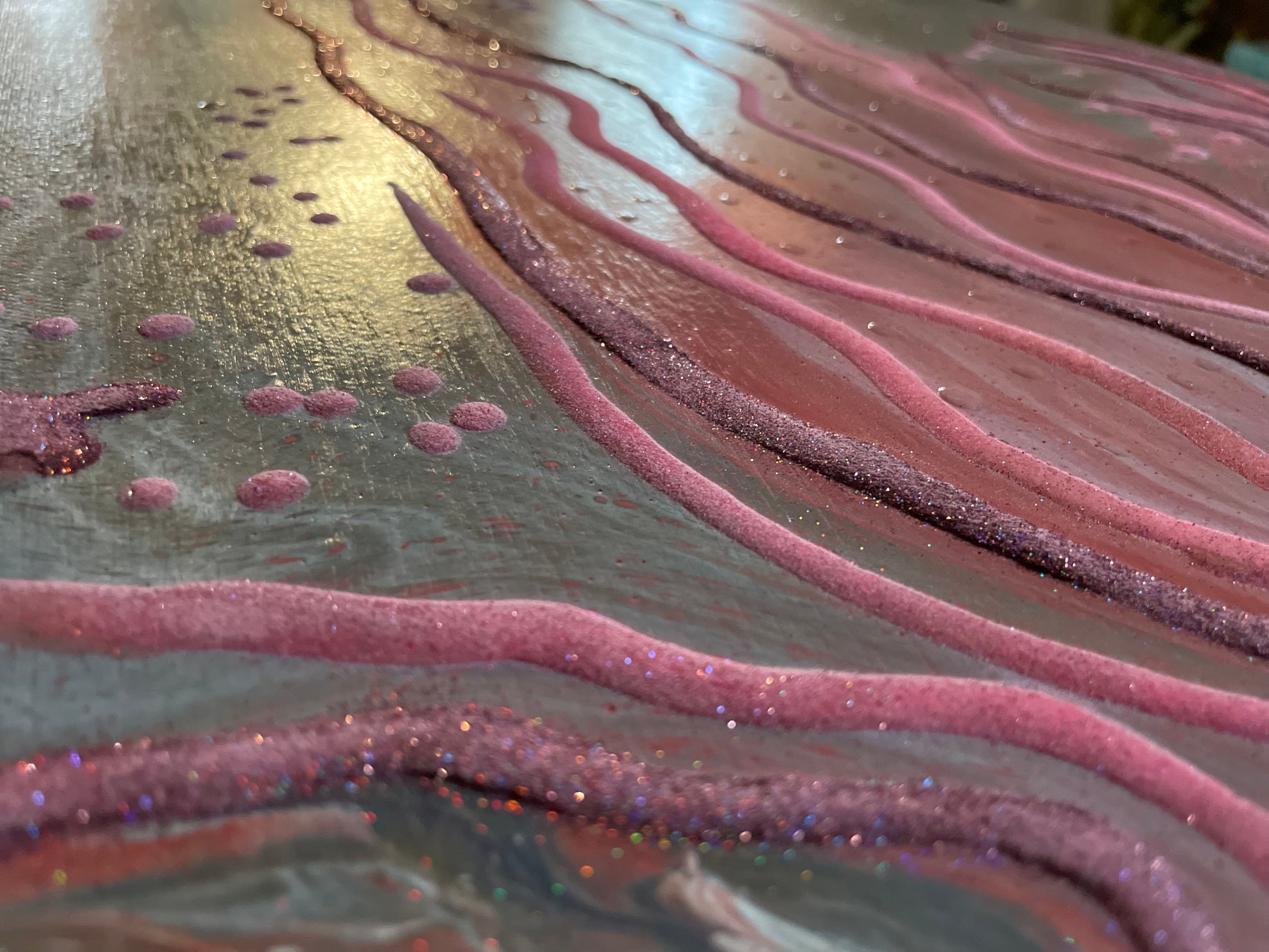 Crushed mirror and metallic powder create extra texture and move with the paint to create art that has the illusion of movement.