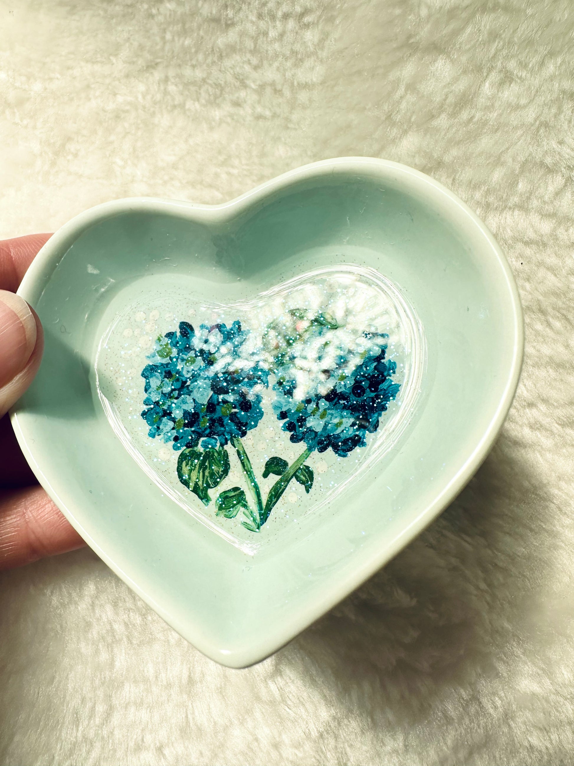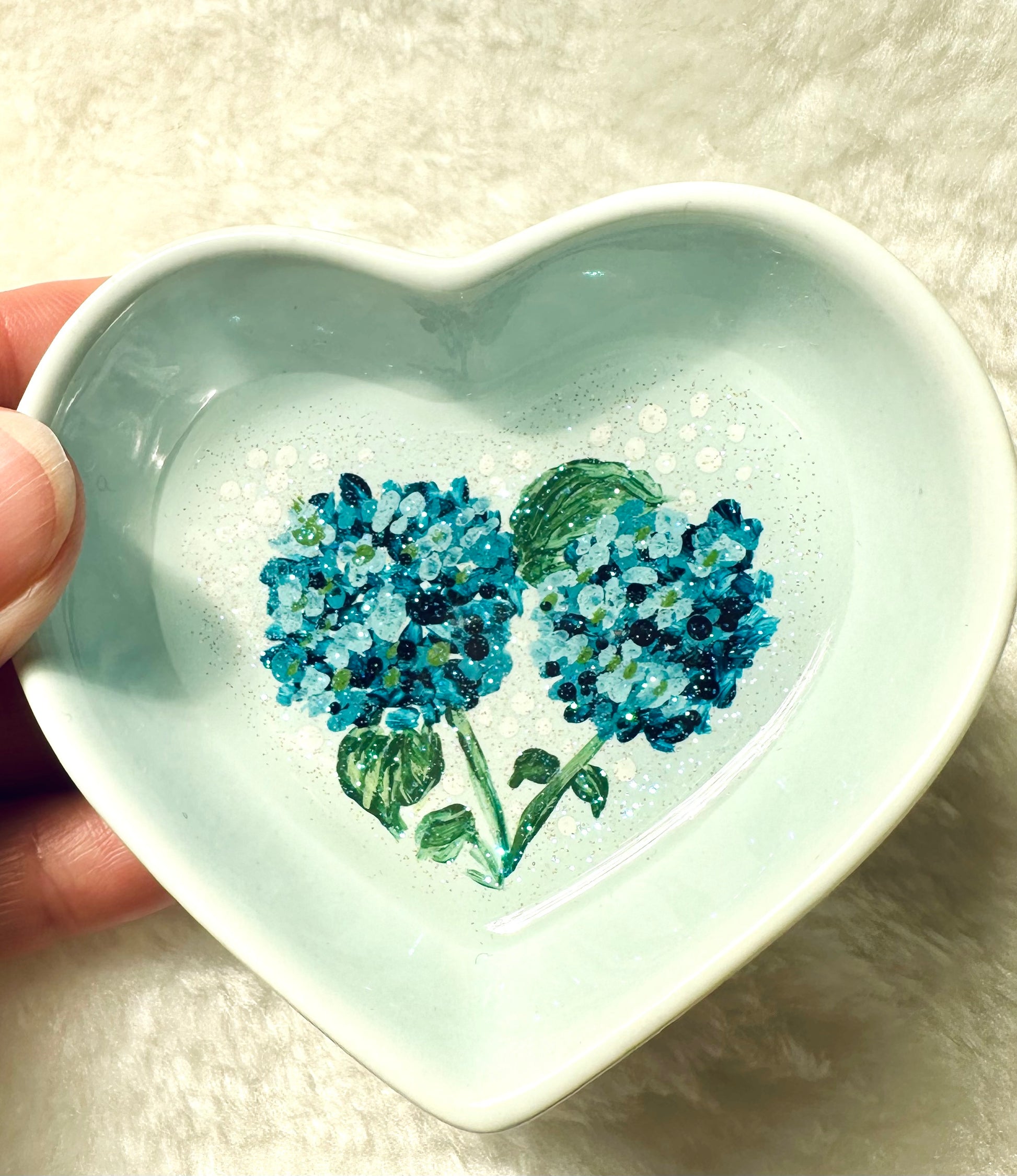 Hand painted and then coated with a layer of resin to protect the art. The small dishes measure 8cm across and 3 cm deep