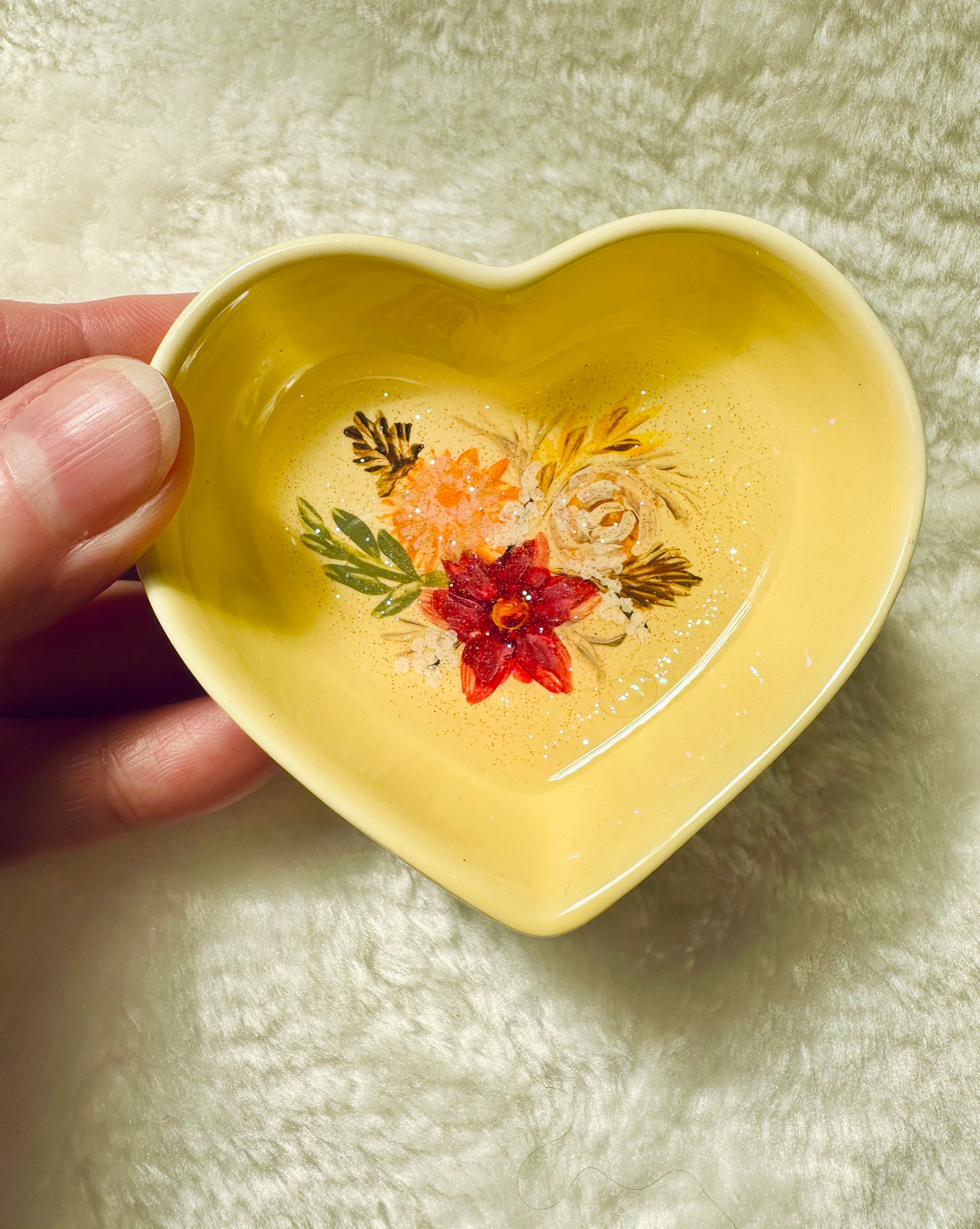 Hand painted and then coated with a layer of resin to protect the art. The small dishes measure 8cm across and 3 cm deep