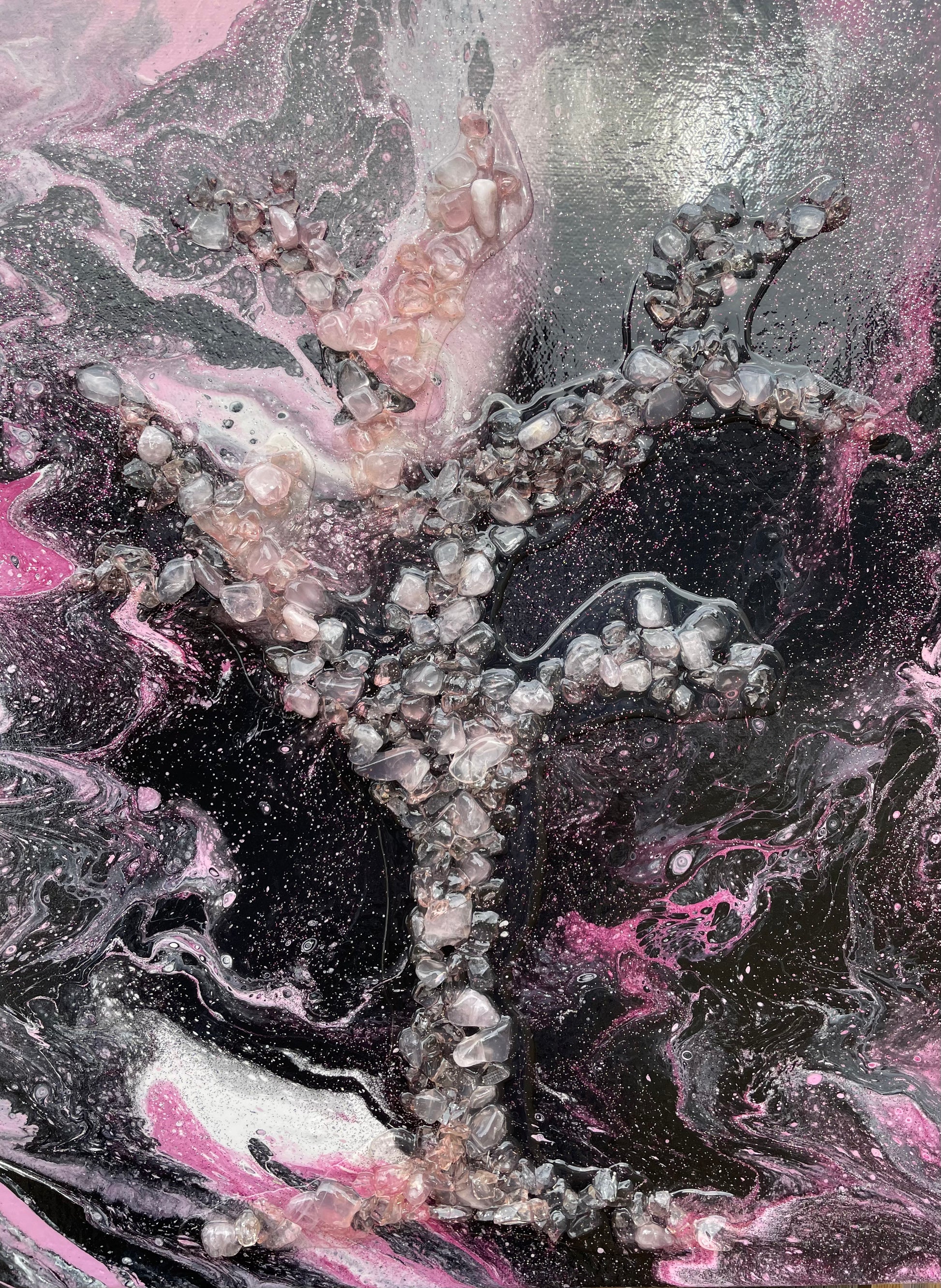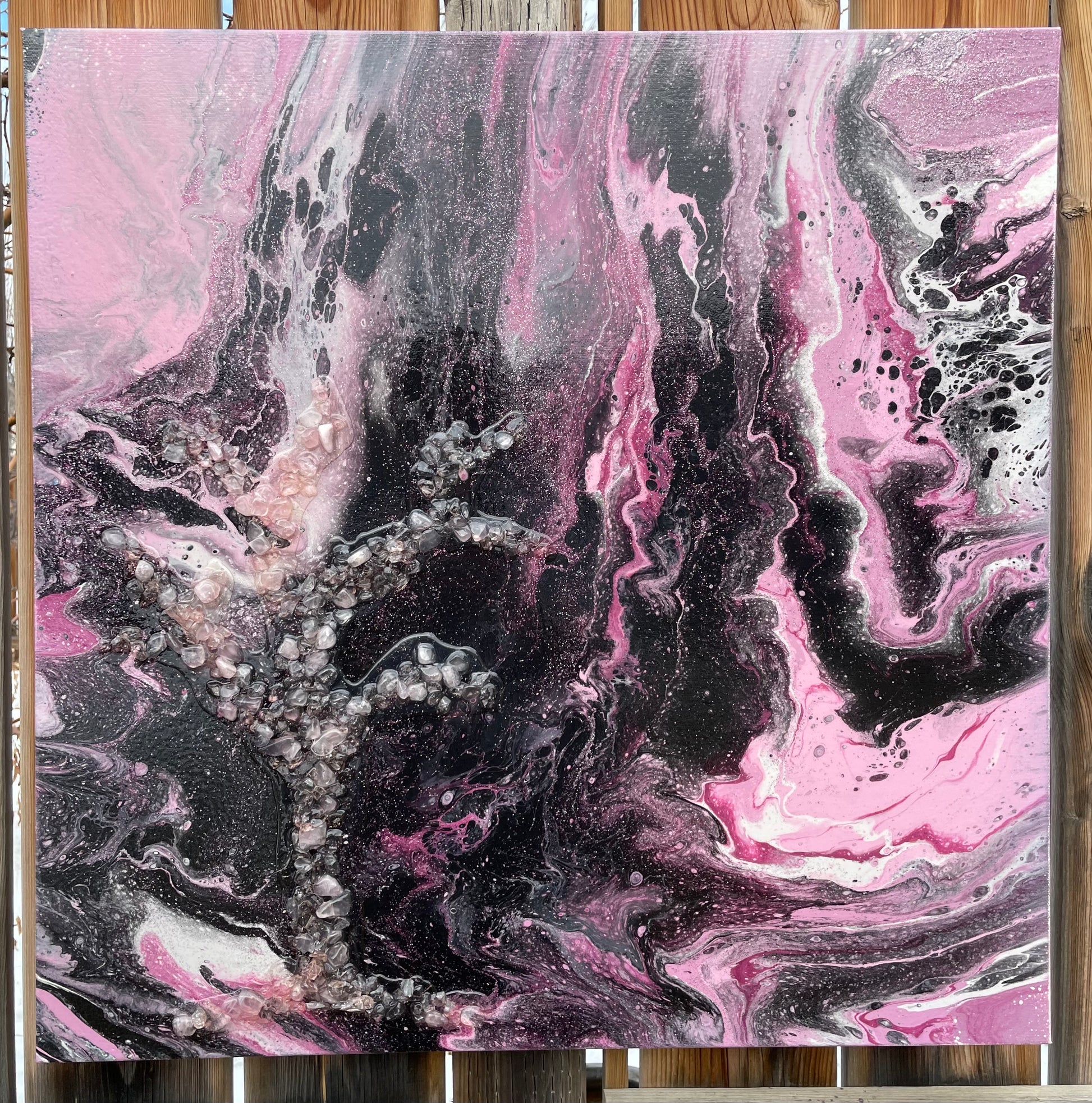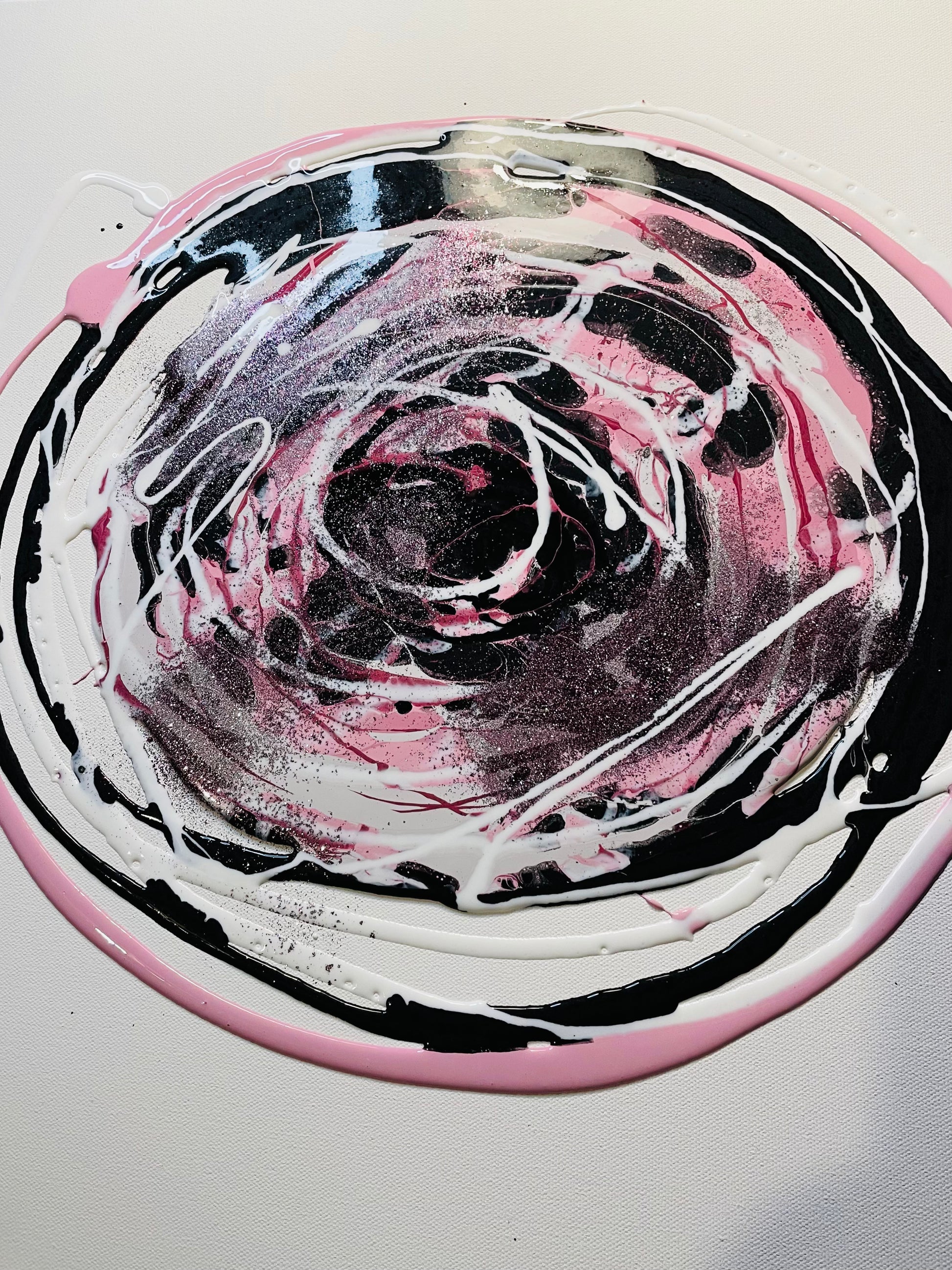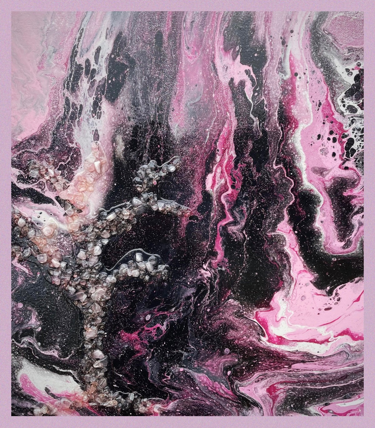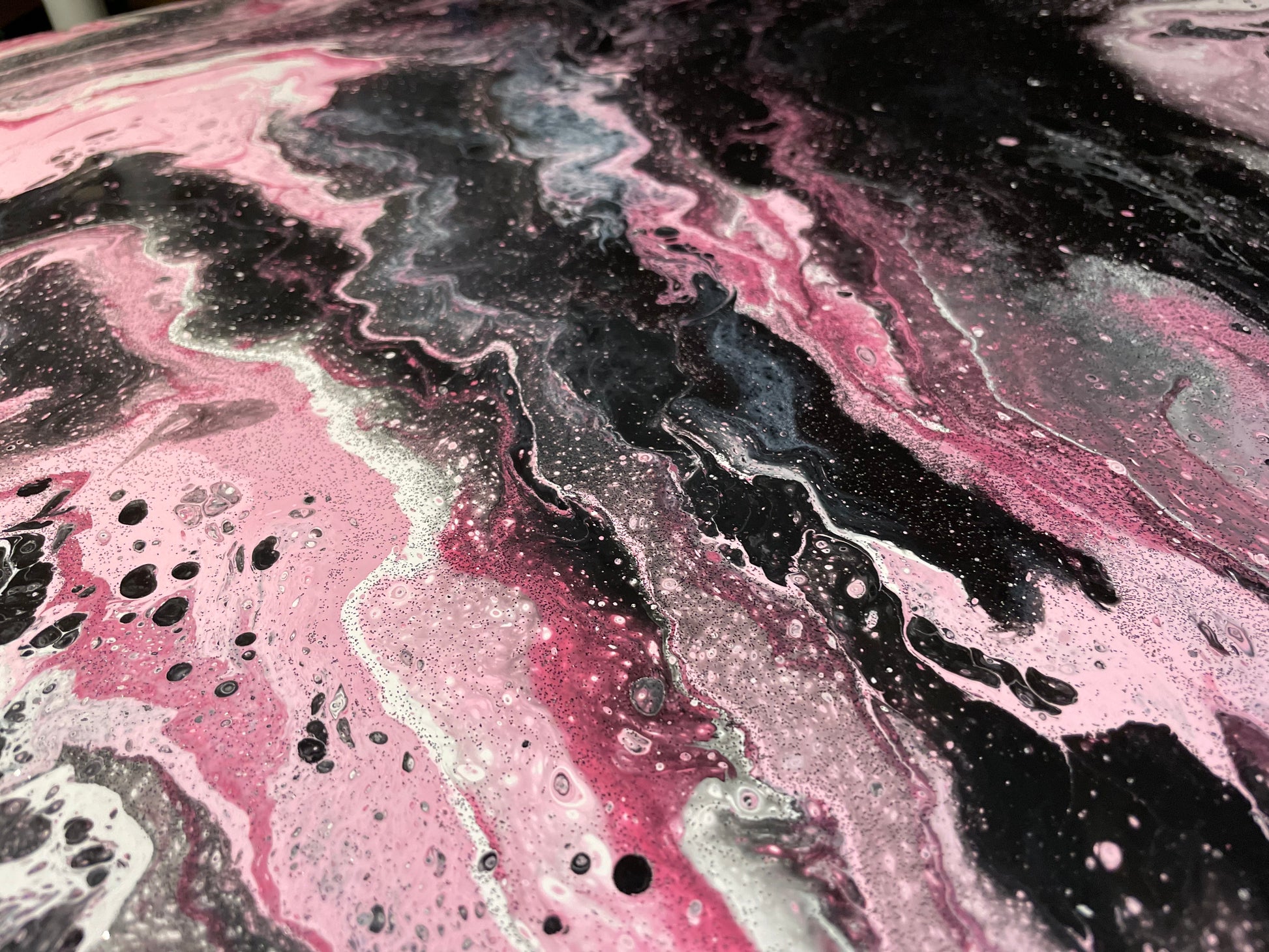 This special piece has some of my favorite colours in it. Strong and vibrant magentas and pinks collide with the softness of white and stabilizing black to create a pour that feels like space.